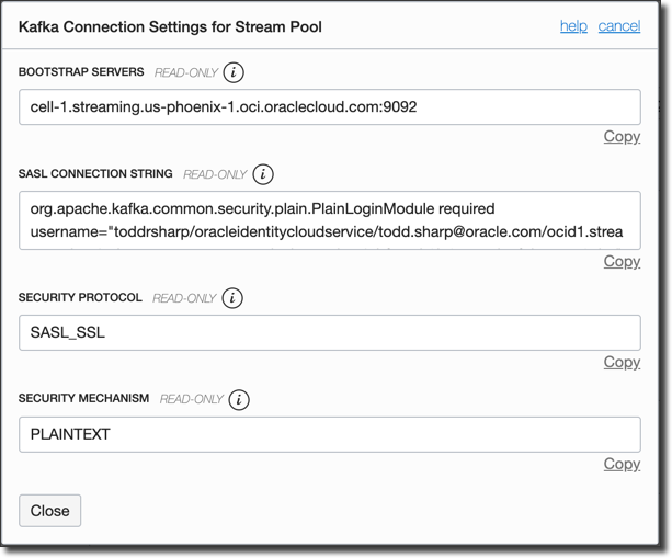 The next dialog will contain some information that we’ll need to copy down for later use. Take note though, you may want to substitute a different username in the SASL Connection String (see the Create A Streams User of this post for more information).