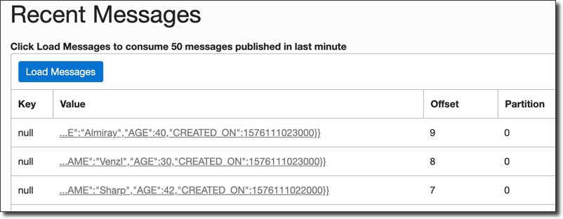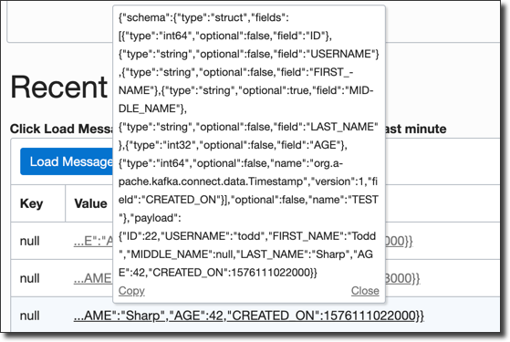 Click into the stream in the console and take a look at the recent messages by clicking ‘Load Messages’ and you’ll see a message for each record that was inserted into the TEST table.
