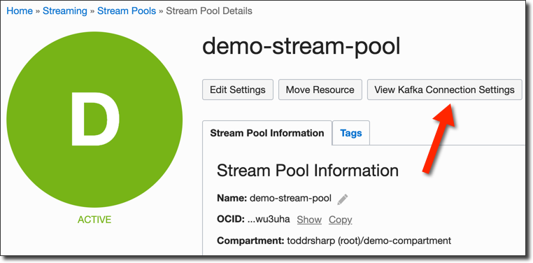Click ‘Create Stream Pool’ and in a few seconds your pool will become ‘Active’. Once it’s active, click the ‘View Kafka Connection Settings’ button.