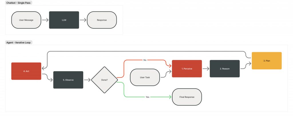 - A chatbot responds in a single pass. An agent persists, adapts, and acts across multiple steps: perceiving its environment, reasoning over available options, executing an action, and observing the result before deciding what comes next.