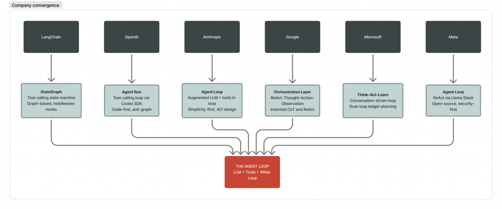 - Every major AI company (OpenAI, Anthropic, Google, Microsoft, Meta) has converged on this same core pattern, despite building very different products around it.