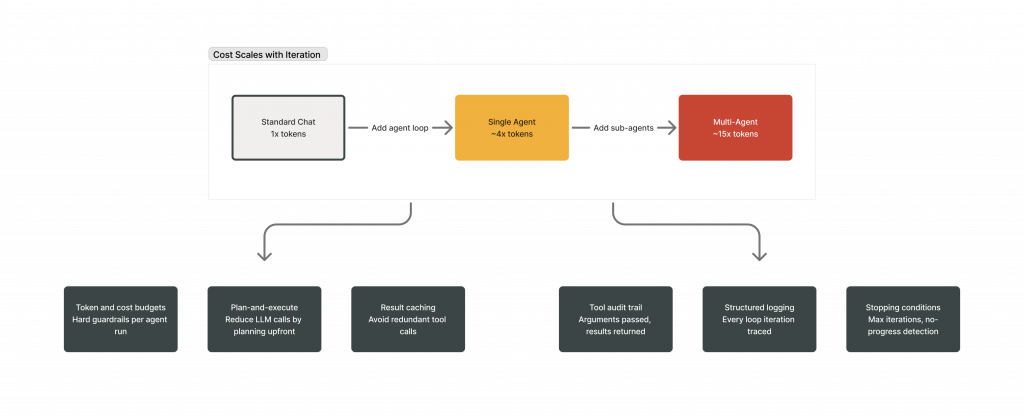 Every loop iteration is an LLM call. Anthropic’s internal data shows that agents consume roughly 4x more tokens than standard chat. Multi-agent systems push that to approximately 15xAt thousands of agent sessions per day, token costs compound with every loop iteration. Without cost controls embedded at the architecture level, this becomes a significant operational constraint.