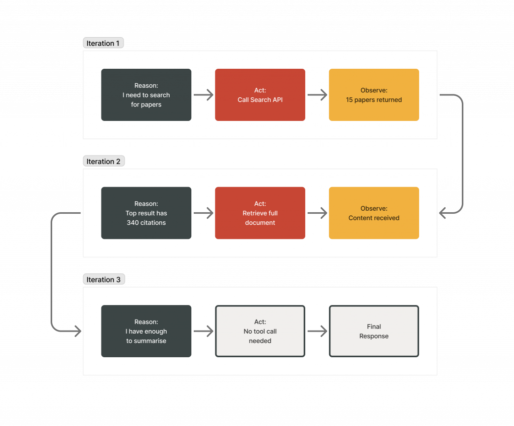 To illustrate how the loop executes in practice, consider the following task: identify the most cited paper on agent memory published in 2026 and summarise its key findings.