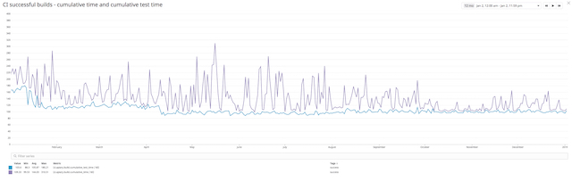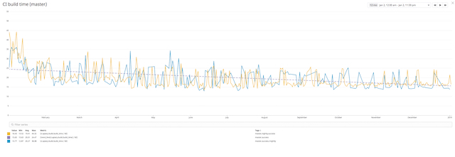In 2016 we had problems with the speed of our test suite. As you can see on the graph below, our tests in that year took 28 min in May and ended up taking up to 50 min in November. This caused multiple problems and affected the team morale. People started ignoring flaky tests and running more retries. The time to deploy was horrible and we couldn’t deploy new features as fast as we built them.