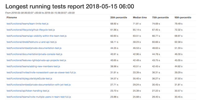 We looked for easy ways to improve the results. We invested more money and divided the test suite to run in parallel containers, going from 4 to 8 containers per single build and eventually ended up using 33 containers in CircleCI (enabling 4 parallel builds of the monolith). We created our own tooling called Testmon that can trigger builds running during the night, collect metrics from those builds, and produce reports which we display in the office to increase visibility of problematic tests. All metrics are pushed into our monitoring, and using PagerDuty we have set up alerting on possible problems, as well as creating incidents to make sure those issues are resolved.