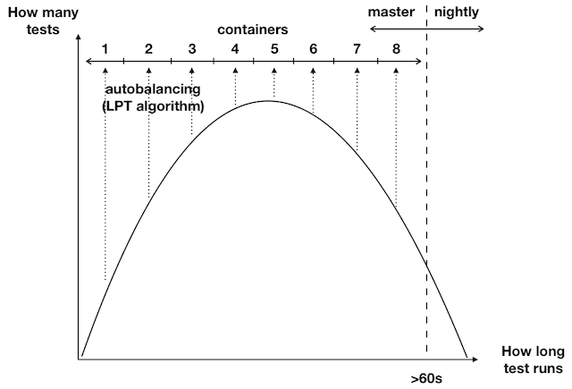 On the graph below you can see how we split the tests into groups. We moved the longest running tests and the least frequently changing parts into nightly builds. We ended up splitting the master test suite into 8 containers. We used Testmon for autobalancing, because every day it calculates the test suite configuration using the LPT algorithm.