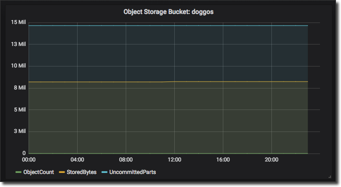 Notice the blue line? Yeah, so did I. In fact, that was the very first thing that jumped out at me. That blue line represents 15Mb of ‘uncommitted parts’. In other words, that’s storage being used for either in progress, aborted or otherwise uncommitted multipart uploads. Now 15Mb is nothing in the scope of a large, enterprise application. In my case it’s just leftovers from when I was testing out multipart upload for another blog post. But for some applications, this number could get large. Really large. A project I was on a few years ago allowed users to upload potentially very large (5-20Gb) video files and handled the uploads via multipart/chunked uploads from pretty much anywhere in the world. Which, as you can imagine, means that from really poor internet connections sometimes. The idea that we could have been paying for potentially terabytes worth of storage for unused files kind of makes me shudder, but with Grafana on OCI you’d be able to quickly and easily keep an eye on these sorts of things. Obviously, it goes much further than this simple example, but I think it illustrates the point well enough.