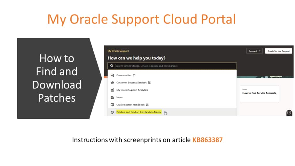 Keeping your Oracle products up to date with the latest patches is essential for security, stability, and support. Get step-by-step instructions for searching and downloading patches from the new MOS portal – including what to do if you have issues. KB863387: https://support.oracle.com/knowledgefs/?docId=KB863387&source=:so:bl:or:awr:oeb:::&SC=:so:bl:or:awr:oeb:::&pcode=