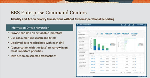 Oracle is pleased to announce the March 2020 update of Oracle Enterprise Command Centers, a set of tightly-integrated, information-rich dashboards to help Oracle E-Business Suite 12.2 users identify and act on priority transactions without custom operational reporting.