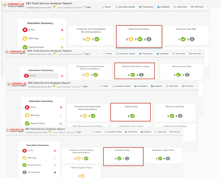 The Oracle EBS Field Service Analyzer is designed to review and report Field Service profiles, setup and data. It checks for proper set up, identifies known data issues, recommends code updates. It is a must-use tool for customers who use the Service and Contract functionality. Running this analyzer proactively and regularly, will help in early detection of Field Service issues, and provide recommendations to resolve errors or issues. The analyzer is so convenient, you can even schedule it to run as a Concurrent Program (like any analyzer).