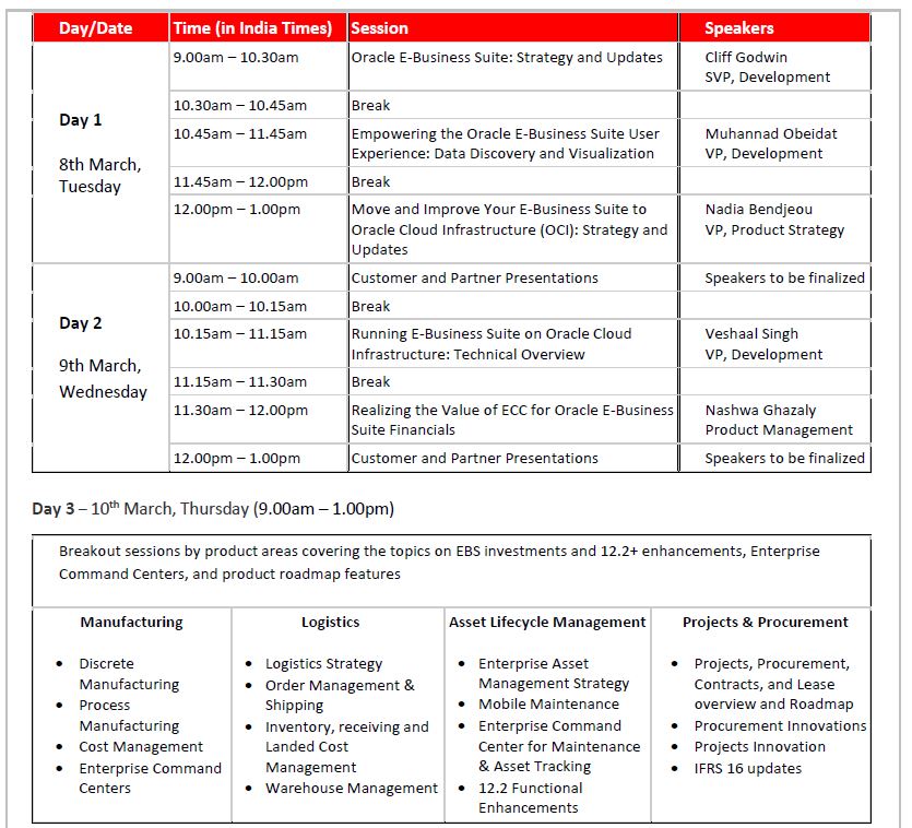 Join us for an exciting 3-day virtual interaction with Oracle product development and industry peers. The focus will be on Oracle E-Business Suite Strategy, EBS on Oracle Cloud Infrastructure, and Enterprise Command Centers, with a deep dive into EBS Manufacturing, Logistics, Procurement, Projects, Contracts, Lease and Asset Lifecycle Management products. This is an exclusive webinar for Oracle Customers and Partners in India and the APAC region and is being conducted annually.