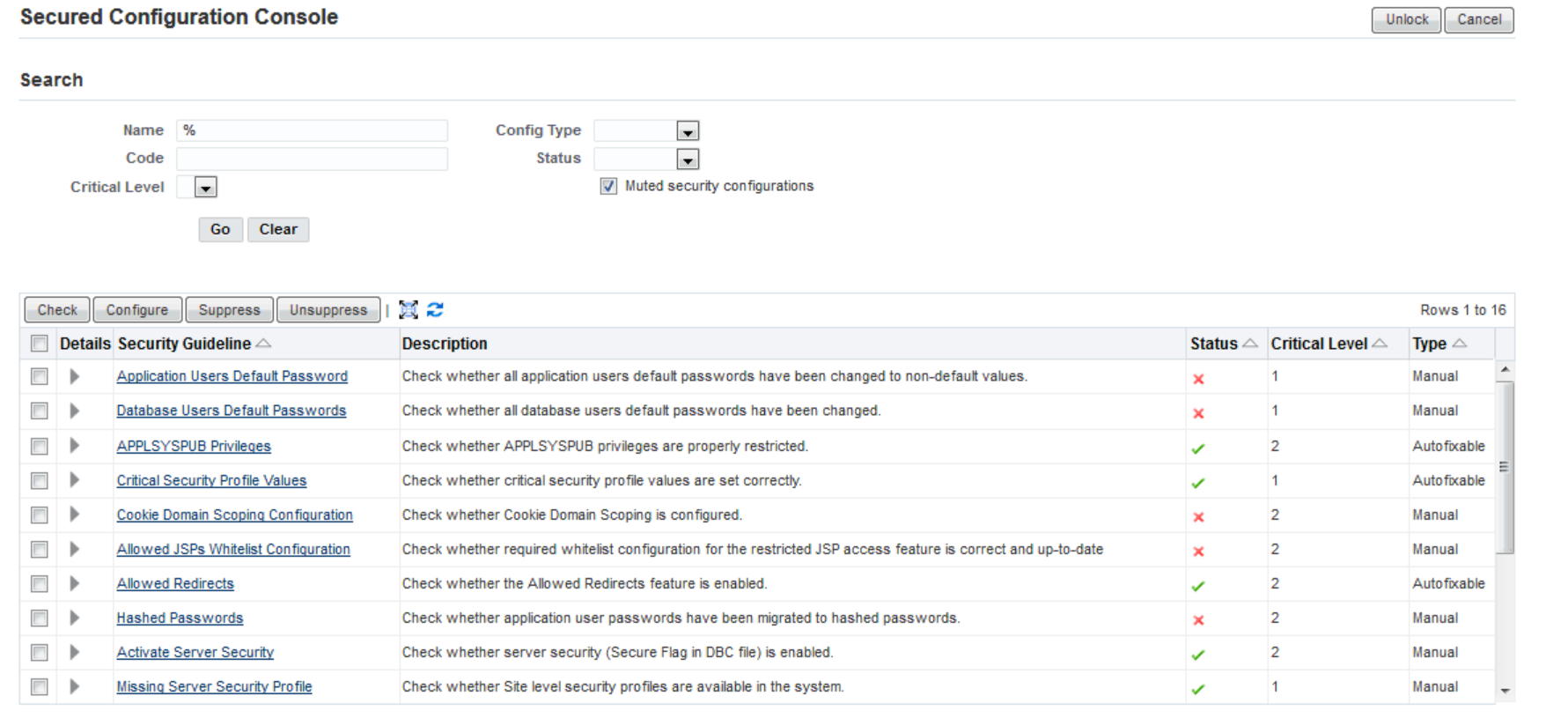 The Secure Configuration Console provides a single dashboard for you to review if your Oracle E-Business Suite environment is in compliance with critical secure configuration guidelines. You may already be familiar with the set of secure configuration scripts that can be executed in your environment to check secure configuration. The Secure Configuration Console expands on these checks providing additional features and a new user interface. You can access the Secure Configuration Console from the Configuration Manager tab via the Functional Administrator responsibility.