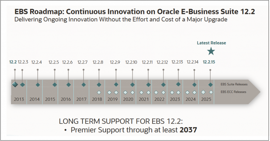 With our commitment to Continuous Innovation, and the availability of Premier Support for Oracle E-Business Suite 12.2 through at least 2037, Oracle gives customers the ability to leverage their Oracle E-Business Suite investment for years to come.