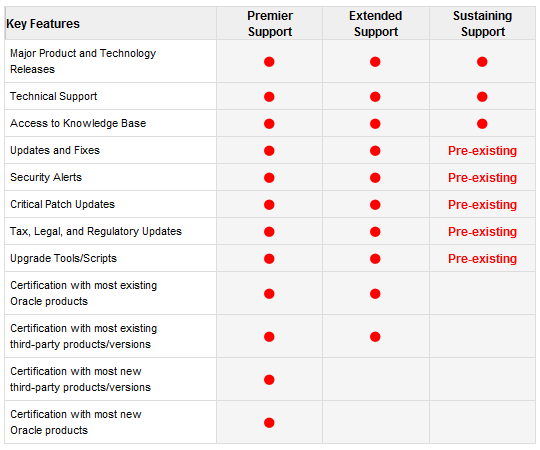 Sustaining Support for these releases starts when Premier Support ends. Under Sustaining Support, you’ll still be able to contact Oracle Support and get help with diagnosing your issues. You’ll still have access to existing patches, workarounds, and Notes.