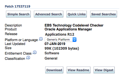 The E-Business Suite Technology Codelevel Checker (ETCC) tool helps you identify application or database tier overlay patches that need to be applied to your Oracle E-Business Suite Release 12.2 system. ETCC maps any missing overlay patches to the default corresponding Database Patch Set Update (PSU) patches, and displays them in a patch recommendation summary.