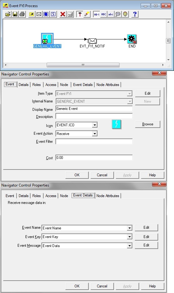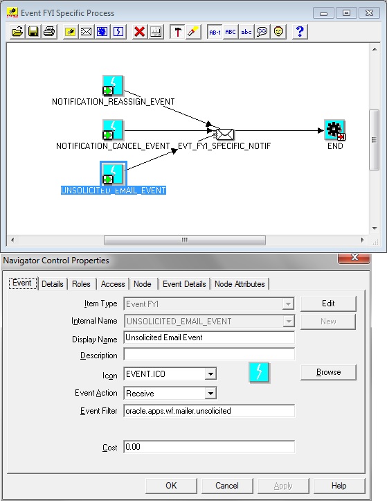 But the workflow process has to have an WFSTD EVENT activity to receive an event. The figure below shows a workflow process that is actually initiated by any event that has a subscription to launch this process. The details of the event, such as its name and key, are captured by the EVENT activity via item attributes and reported in the FYI notification.