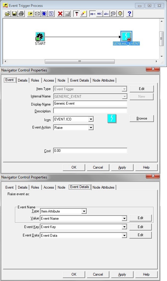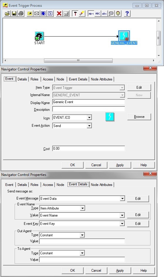 Alternatively, the figure below shows a workflow process that sends an event whose name and key are determined via item attributes. Note that additional information, such as Out Agent and To Agent, could be provided in this case.