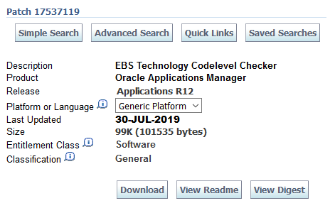 The E-Business Suite Technology Codelevel Checker (ETCC) tool helps you identify application tier or database tier patches that need to be applied to your Oracle E-Business Suite Release 12.2 system.