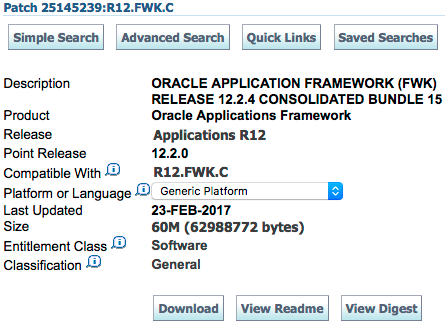 - Oracle Application Framework (FWK) Release 12.2.4+ Bundle 15 (Patch 25145239:R12.FWK.C)