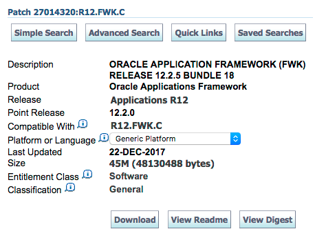 - Oracle Application Framework (FWK) Release 12.2.5 Bundle 18 (Patch 27014320:R12.FWK.C)