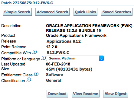 - Oracle Application Framework (FWK) Release 12.2.5 Bundle 19 (Patch 27256875:R12.FWK.C)