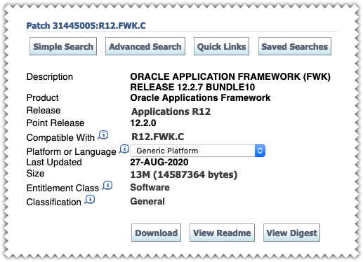 - Oracle Application Framework (FWK) Release 12.2.7 Bundle 10 (Patch 31445005:R12.FWK.C)