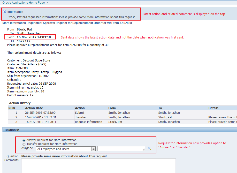 If an action is performed on a notification such as Reassign, Request for Information or Provide Information, the recipient of the notification will see who performed the last action and the associated comment on top of the notification.