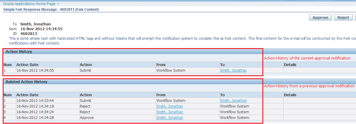So far it was possible to embed Action History of an response-required notification into another FYI notification using #RELATED_HISTORY attribute (Please refer to Workflow Developer Guide for details about this attribute). The enhancement now enables developers to embed Action History of one response-required notification into another response-required notification.