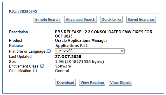 Per the recent ETCC update announcement, the FMW consolidated zip file Patch 38286345, as documented in Oracle E-Business Suite Release 12.2: Consolidated List of Oracle Fusion Middleware Patches and Bug Fixes (MOS Note 2877607.1) now includes the following: