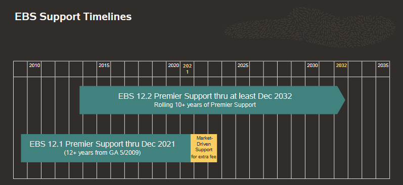 Oracle E-Business Suite (EBS) 12.1 has been in Premier Support since May 2009. EBS 12.1.3 will move to Sustaining Support on January 1, 2022. See the following for more information:
