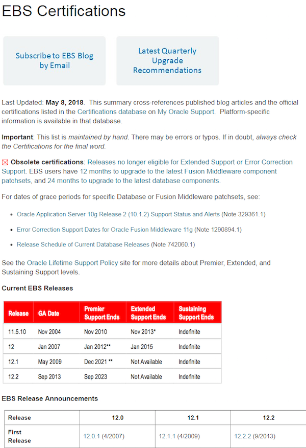 Since I announce all of my team’s certifications here on this blog, I’ve also created a one-page summary of all blog articles covering EBS technology stack certifications. This summary page is maintained manually, so if there’s any gap between the MOS Certifications database and this summary, the Certifications database wins.