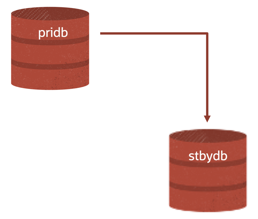 At this point we have the following. Note that the connector from the pridb into stbydb is terminated by a round terminator and not an arrow, this is to indicate that REDO APPLY is still OFF at this point.