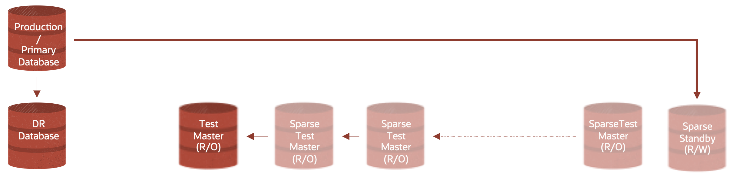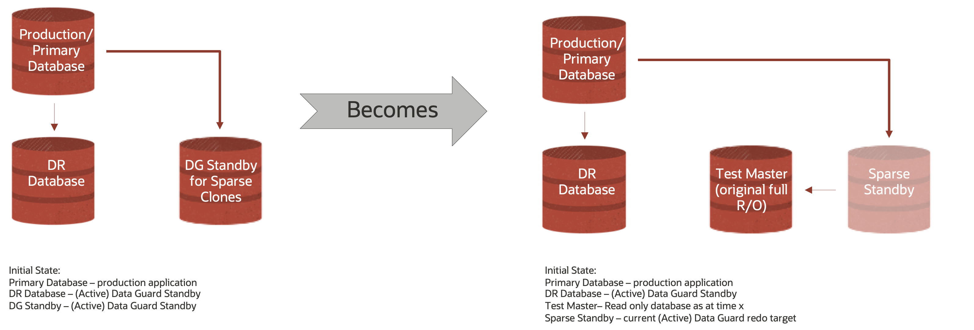 The below graphic shows a initial state whereby you would have two (2) Active Data Guard Standby targets – one for DR and the other for Sparse Clones
