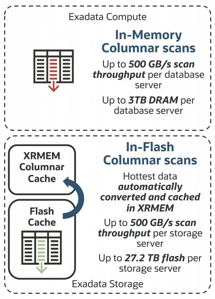 Because memory is relatively expensive, Exadata uses both memory and flash to store the in-memory columnar data managed by the DBIM capabilities. Flash in Exadata storage expands the total capacity for in-memory data up to 27.2 TB with a scan throughput of up to 100 GB/s* per storage server and increases parallelism through its scale-out storage architecture. Additionally, the data-intelligent Exadata software converts the hottest data into columnar cache format and places it in Exadata RDMA Memory (XRMEM), delivering Exadata Smart Scan speeds up to 500 GB/s* per X11M storage server.