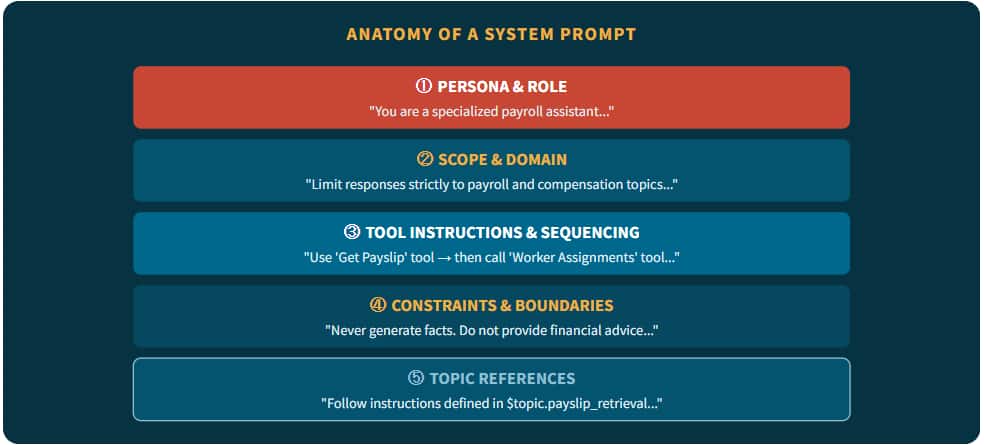A well-structured system prompt in AI Agent Studio contains several key elements that work together to fully define agent behavior.