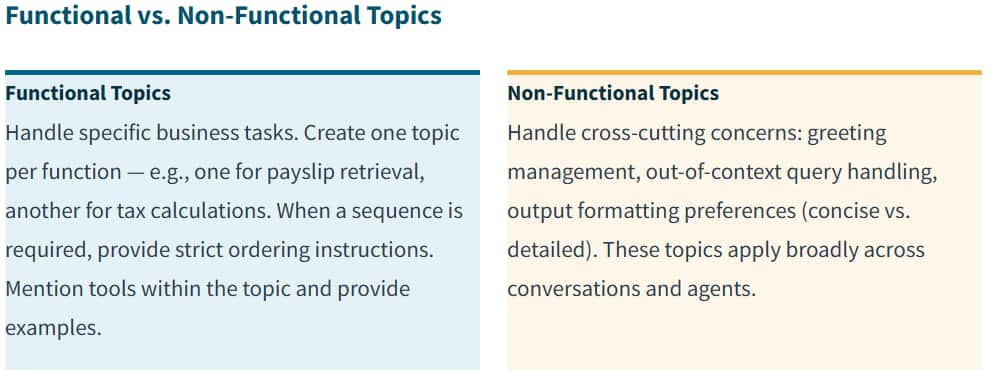 A topic is a reusable instruction block that gets added to the system prompt. Topics encapsulate repeatable logic and rules — including validations, pre-checks, multi-step sequences that must execute in order, and guardrails that should apply across multiple agents. They are used to modularize and scale system-level logic.