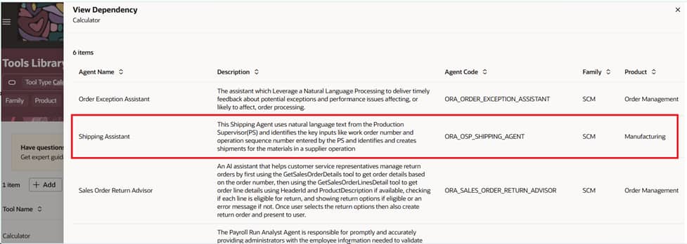• View Dependency — If you to see which workflows/agents are using this tool, you an get the list under View Dependency link. In this example, the tool is being used in a delivered template “Shipping Assistant”.