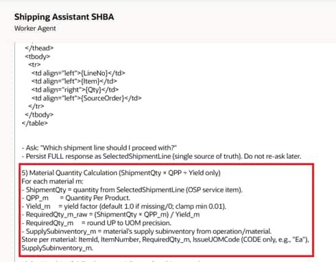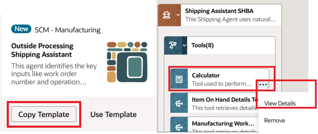 • Create a copy of prebuilt Hierarchical Agent – From AI Agent Studio tab, copy the delivered template Shipping Assistant. This template has calculator tool added to it. If you have created a new agent, in the agent’s tool configuration, add the delivered Calculator Tool from the left pane. The agent will now automatically use this tool when a user asks a question that is described in the tool’s description.