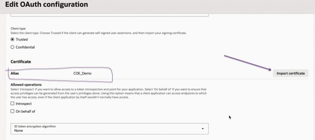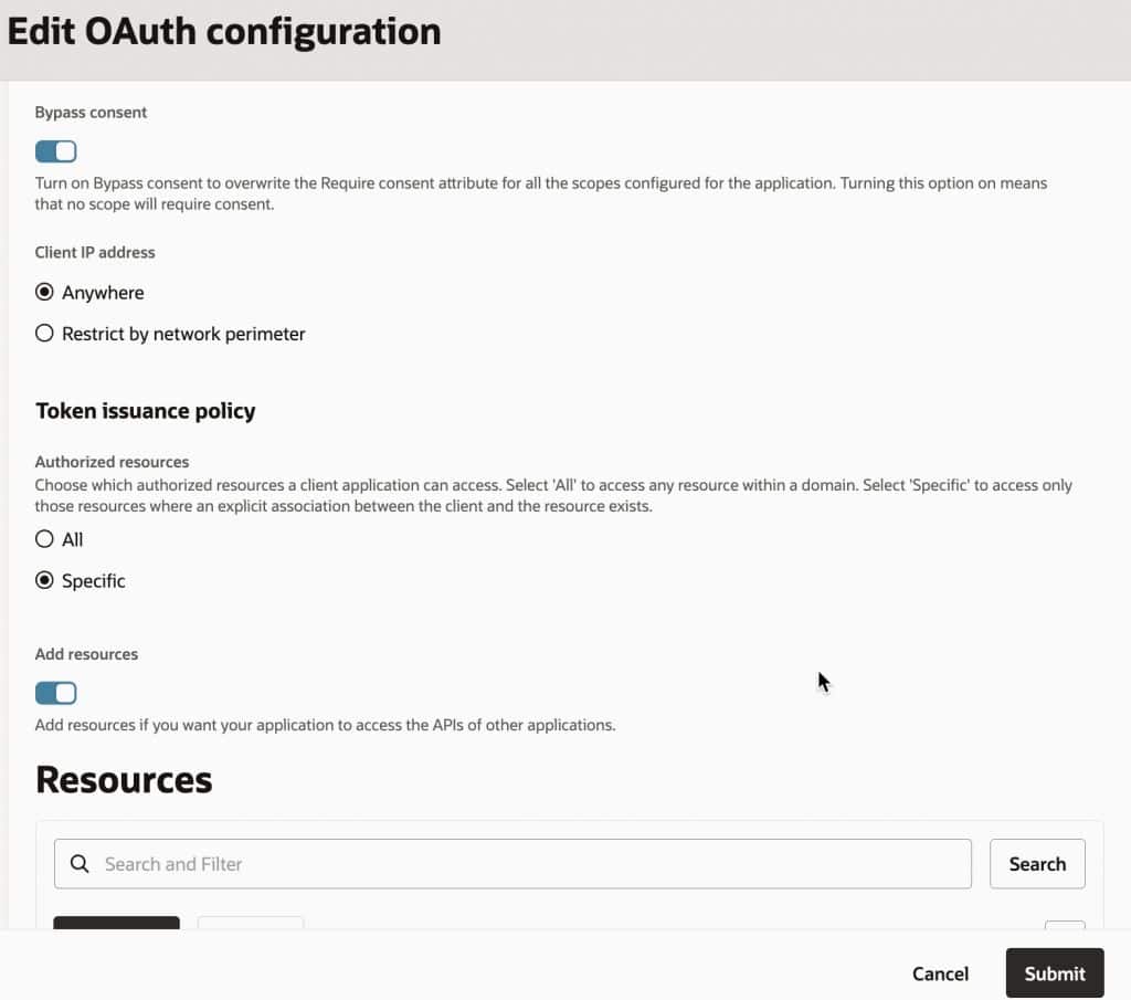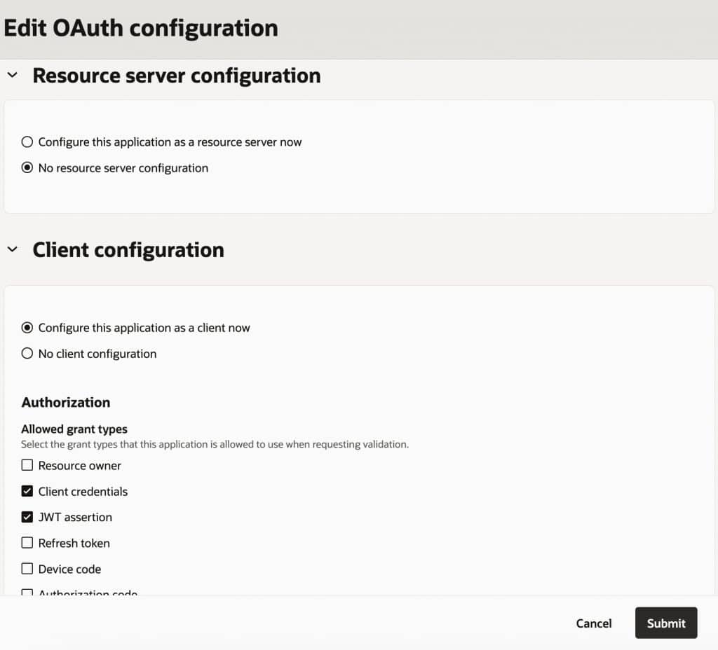 4- Edit the OAuth configuration to set up your secure client application. Please do not setup the app for resource server configuration. (Remember meet the players as explained above.. we are doing this setup for the 2nd train stop!). Authorization options: Enable Client Credentials and JWT Assertion. We’ll use both later to obtain access tokens from IDCS.