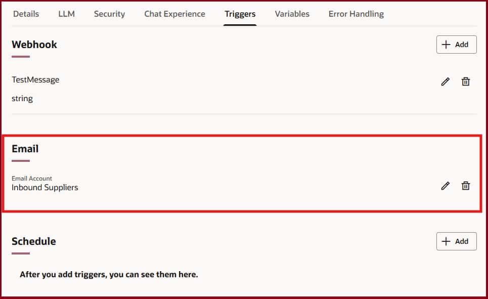 The Email Trigger is a built-in capability of workflow agents in Oracle Fusion AI Agent Studio. It allows the workflow agent to monitor a designated mailbox by polling it at a configured interval. When a new unread email appears, it fires the workflow — reading the email body, subject, attachments, and sender details — all without any manual action. The workflow agent can also respond automatically to original sender of the inbound emails.