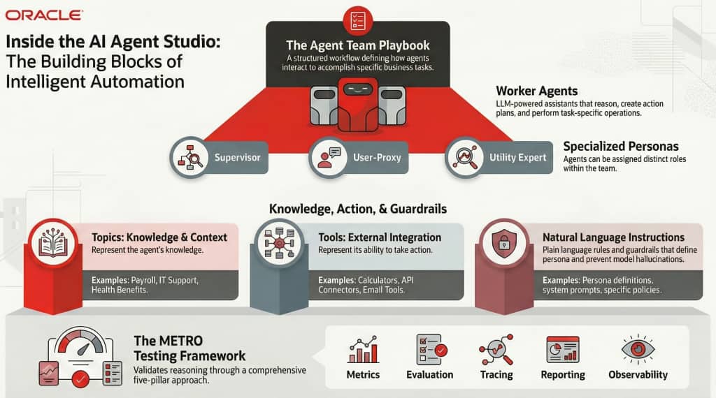 The primary purpose of the Studio is to allow users to create, configure, validate, and deploy agents. It offers a combination of pre-built agent template libraries for common scenarios (such as opportunity-to-quote processing) and extensibility tools to customize agents for specific industry needs. To understand how these agents function, we must examine the specific components that form the blueprint of the Studio.