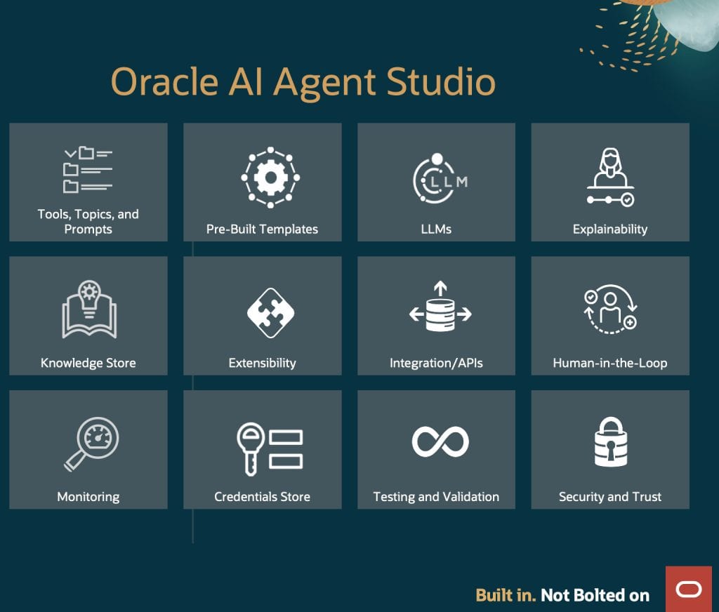 Enterprise Intelligence, Built-In The studio is guided by a core architectural philosophy: “Built in. Not Bolted on.” Traditional AI implementations often require external “bolted-on” integrations that struggle to maintain data consistency and security. In contrast, Fusion AI Agent studio is native to the Oracle Cloud enterprise applications it serves. Because it is Fusion-native, business objects, user roles, data security, and organizational business flows are inherent to the agent’s design. This native approach ensures that security, auditability, and real-time execution are part of every step the agent takes.