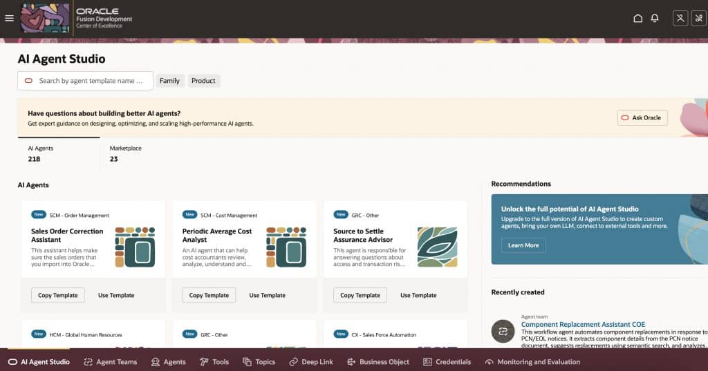 AI Agent Studio is a specialized design-time environment that lets you create, configure, test, and deploy AI agents for your organization. You don’t need complicated external apps – everything happens directly within the Fusion Applications ecosystem. Simply start with leveraging seeded agent templates delivered by Oracle for common customer use cases to accelerate your AI adoption.