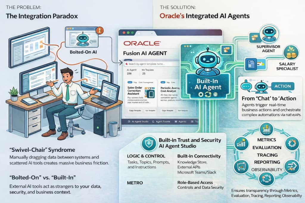 That’s where Oracle’s Fusion AI Agent Studio comes in. This isn’t an external bolt-on, but a design environment where AI operates as a native teammate. By embedding intelligence directly within the business objects and processes of Oracle Fusion Cloud Applications, we’re shifting from background conversations to immediate, real-time business action.