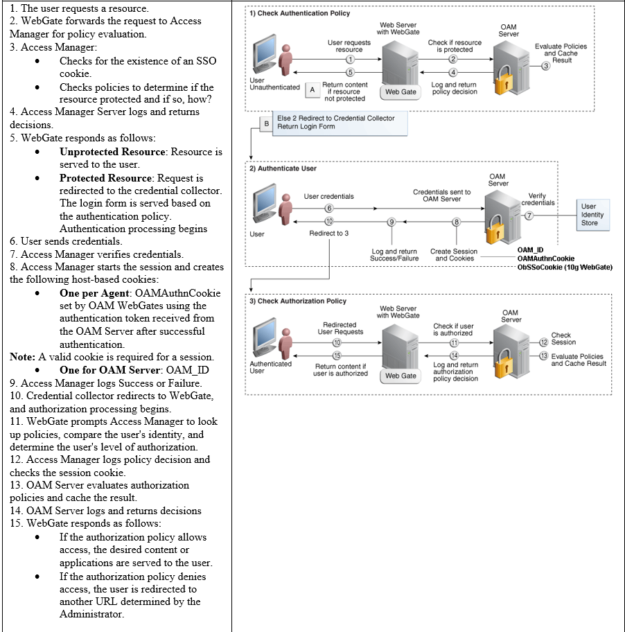 The below figure shows the processes involved in evaluating policies, validating a user’s identity, authorizing the user for a protected resource, and serving the protected resource. This example shows the OAM Agent flow. There are slight variations with 12c WebGates/Access Clients.