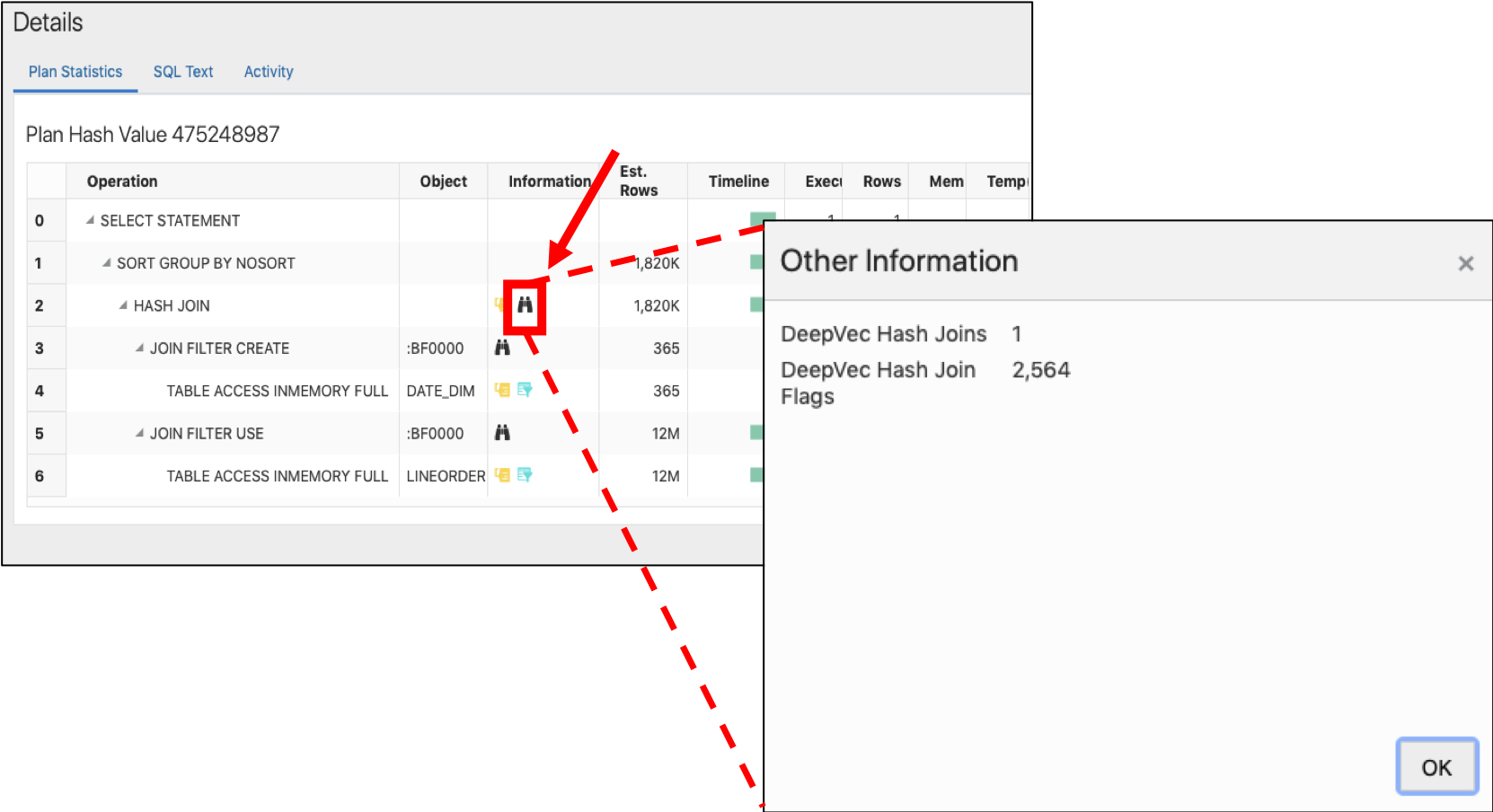 Since it is a run-time decision on whether an In-Memory vectorized join will be used there is no direct information available in an execution plan, but a SQL Monitor active report can be used to determine if an In-Memory vectorized join was used for a particular query. Similar to how to determine if a Join Group was used, clicking on the binoculars icon for the hash join will bring up a window that will list two statistics, DeepVec Hash Joins and DeepVec Hash Join Flags, that determine whether an In-Memory vectorized join took place. For an example see the image below: