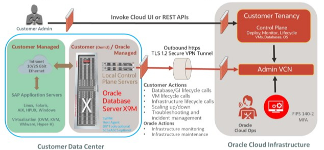 Oracle manages all aspects of the Exadata Cloud@Customer X9M infrastructure deployed in customers’ data centers, including firmware upgrades, virtualization host (Dom0) patches, and updates and patches for database tools and Oracle Grid Infrastructure to an image server that runs on the control plane server, which is also part of the Exadata Cloud@Customer X9M infrastructure.