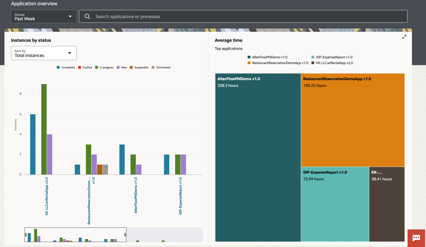 - You will be able to select your application of choice and be able to see the key process level information such as status by process, instance count details and average completion time