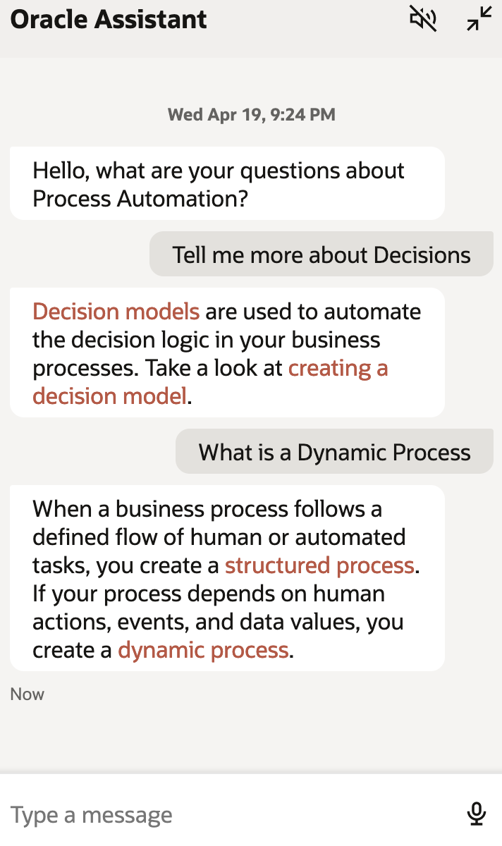 You can now interact via the Oracle Assistant to get details from the Technical Documentation. This allows you to conversationally engage to get questions answered as well as get information quickly to help learn the service and accelerate time to value.