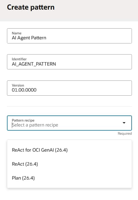Another key functionality, Agent Patterns, is leveraged in this use case. Here we have selected out of the box ReAct (26.4) pattern, which will install the underlying components from recipe library. Agent Patterns allow you to define guidelines. The intent of this pattern is to ensure that agents are consistent, compliant, secure, and scalable across use cases. The result is an AI agent that not only delivers intelligent automation but also adheres to the required compliance, operational, and architectural standards defined for the enterprise. Oracle provides compliance guidelines for the agent pattern, which can be customized as needed.